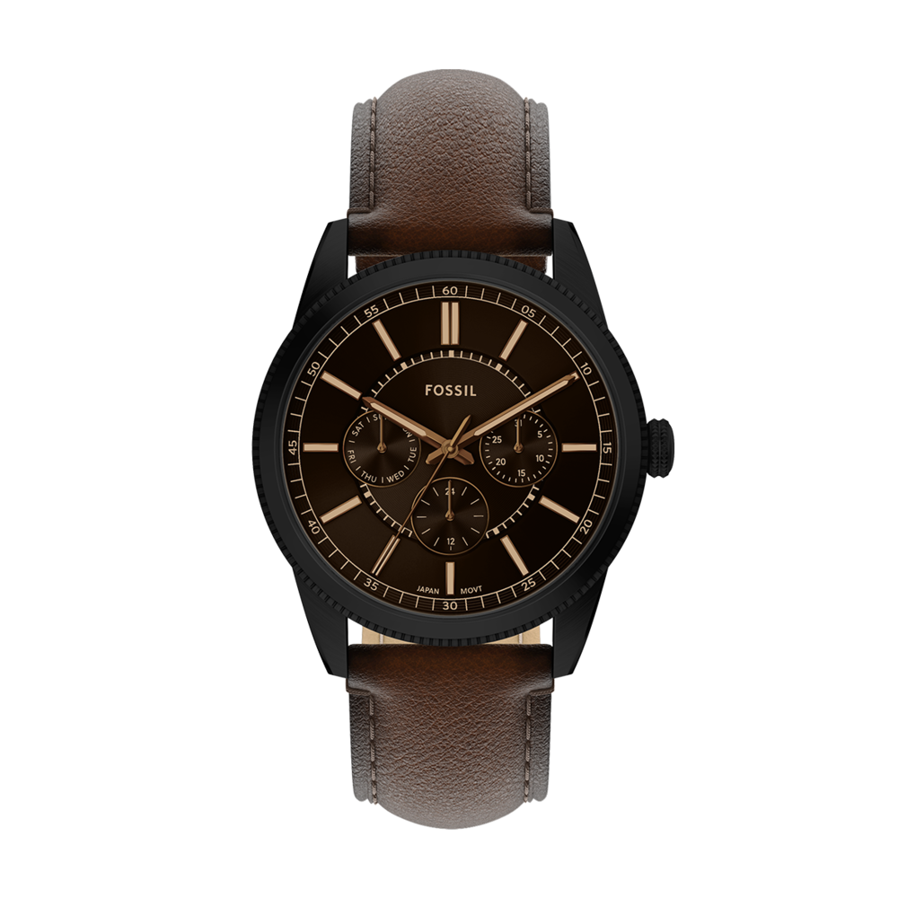 A black stainless steel case pairs seamlessly with a rich brown leather strap for a refined yet approachable look. The black sunray dial under an amber crystal, adds subtle depth and texture, complemented by practical sub-dials for day, date, and 24-hour functionality. The round case design balances modern versatility with thoughtful craftsmanship, creating a reliable timepiece designed for daily wear.