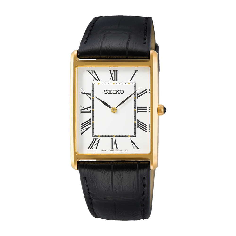 Seiko men's, analogue, quartz, gold tone, white dial, leather strap watch