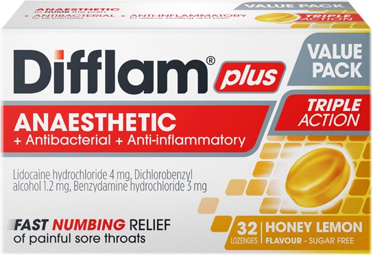 Difflam Plus Anaesthetic + Antibacterial + Anti-Inflammatory Sore Throat Lozenges Honey Lemon Value Pack 32s