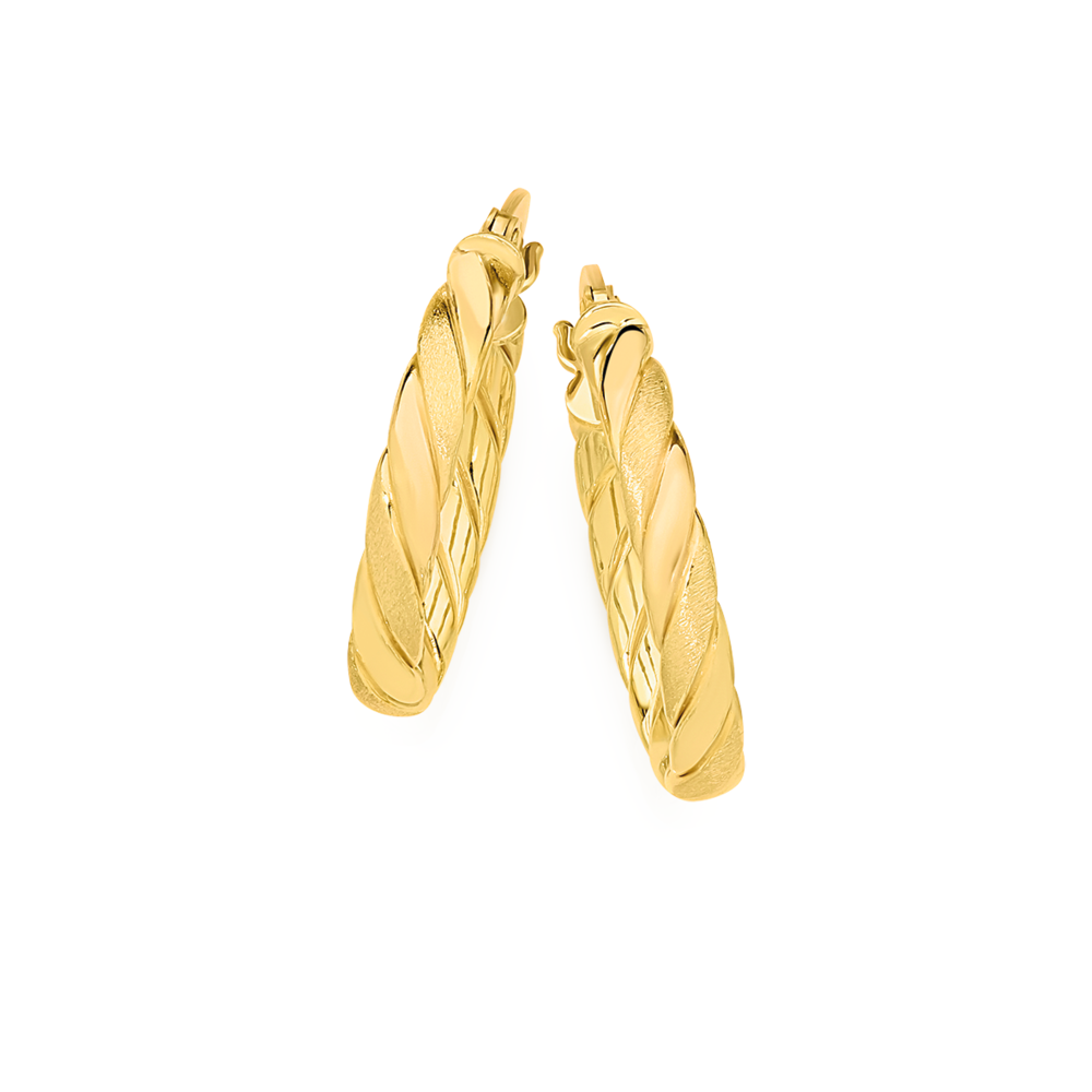 Italian Made 9ct Gold 15mm Polished & Satin Twist Hoop Earrings. Approxiamted Dimensions: 2.4mm x 15mm Inner Diameter