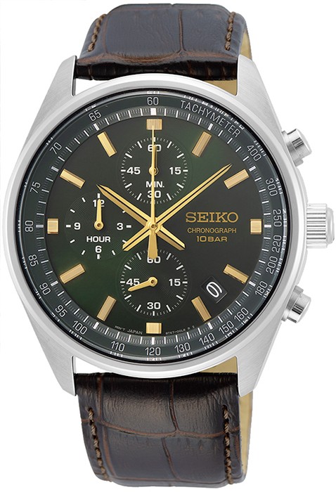 Seiko men's, chronograph, silver tone, Green dial, Brown leather strap, 100m water resistant watch.