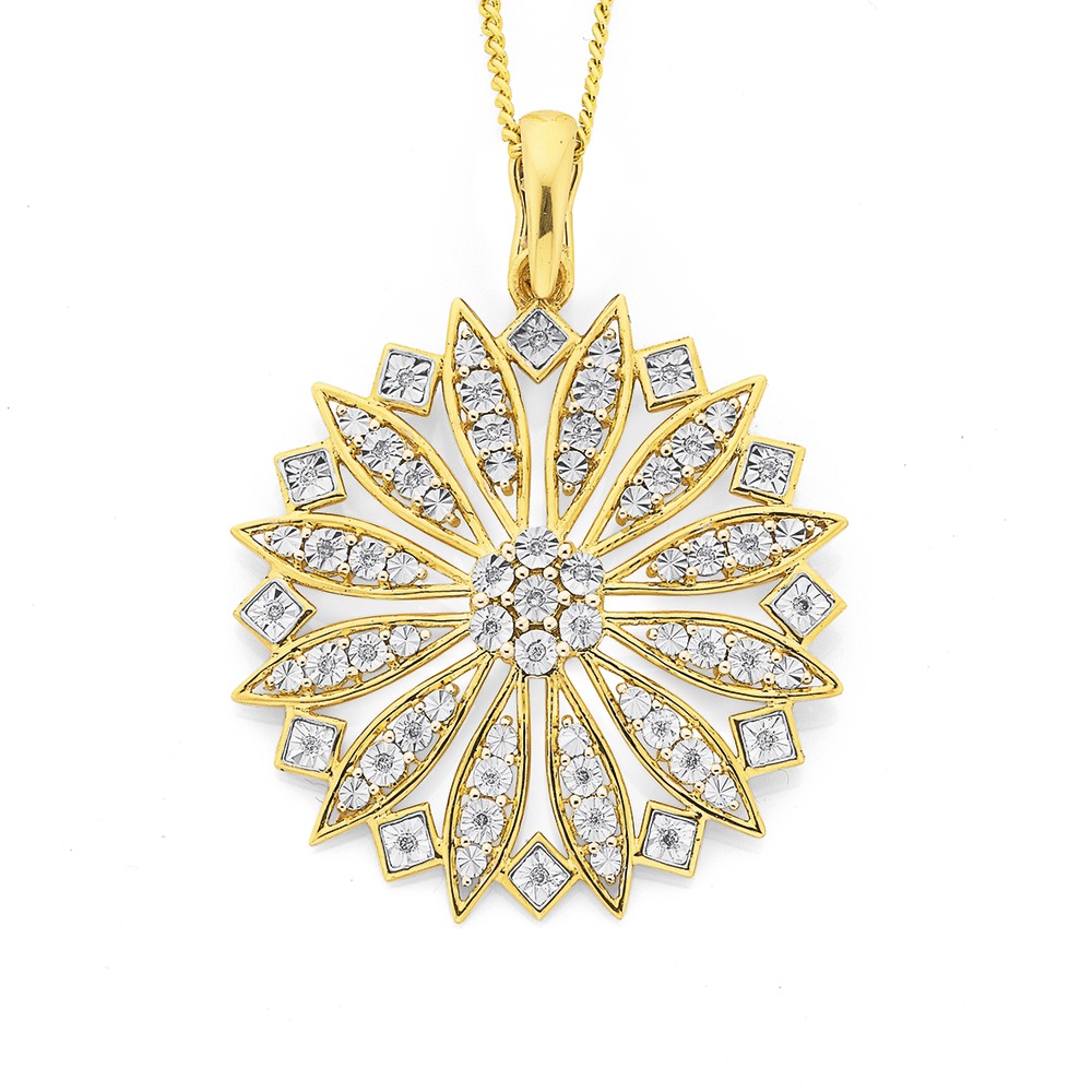 9ct Gold Diamond Large Miracle Set Cluster Wheel Enhancer Pendant Total Diamond Weight =.10ct. Size = Approx. 38mm x 28mm Including Bale.