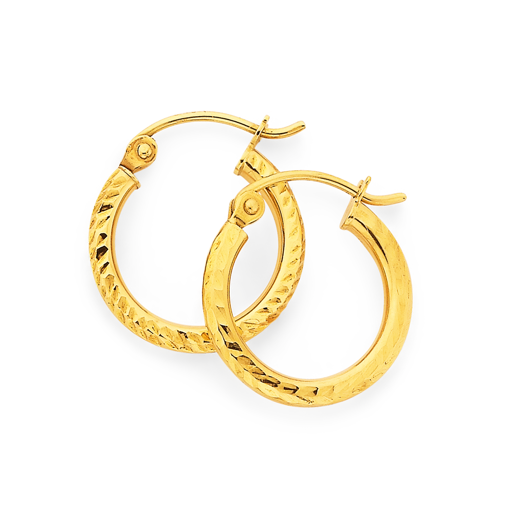 European Made 9ct Gold Diamond-cut Finish Hoop Earrings - Approximate Dimensions 2mm Width x 10mm Inner Diameter.