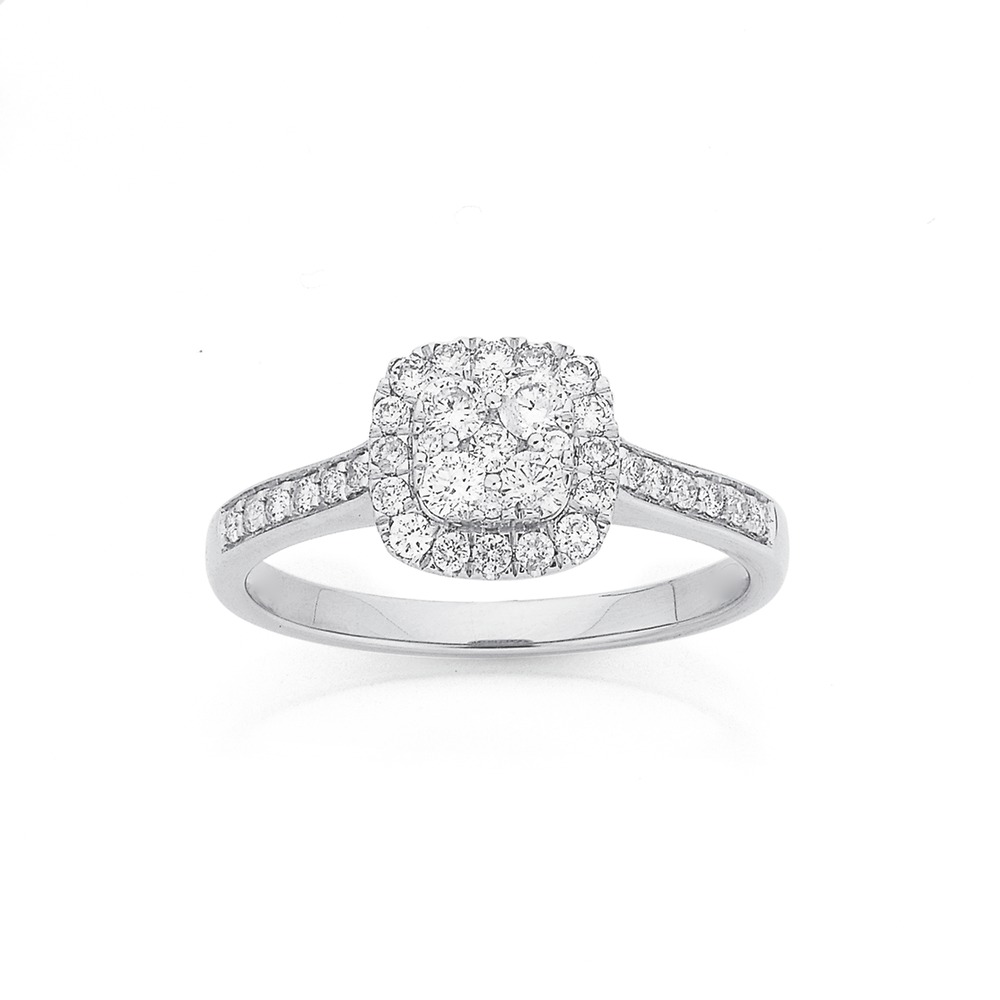 9ct White Gold Diamond Cushion Halo Cluster Ring