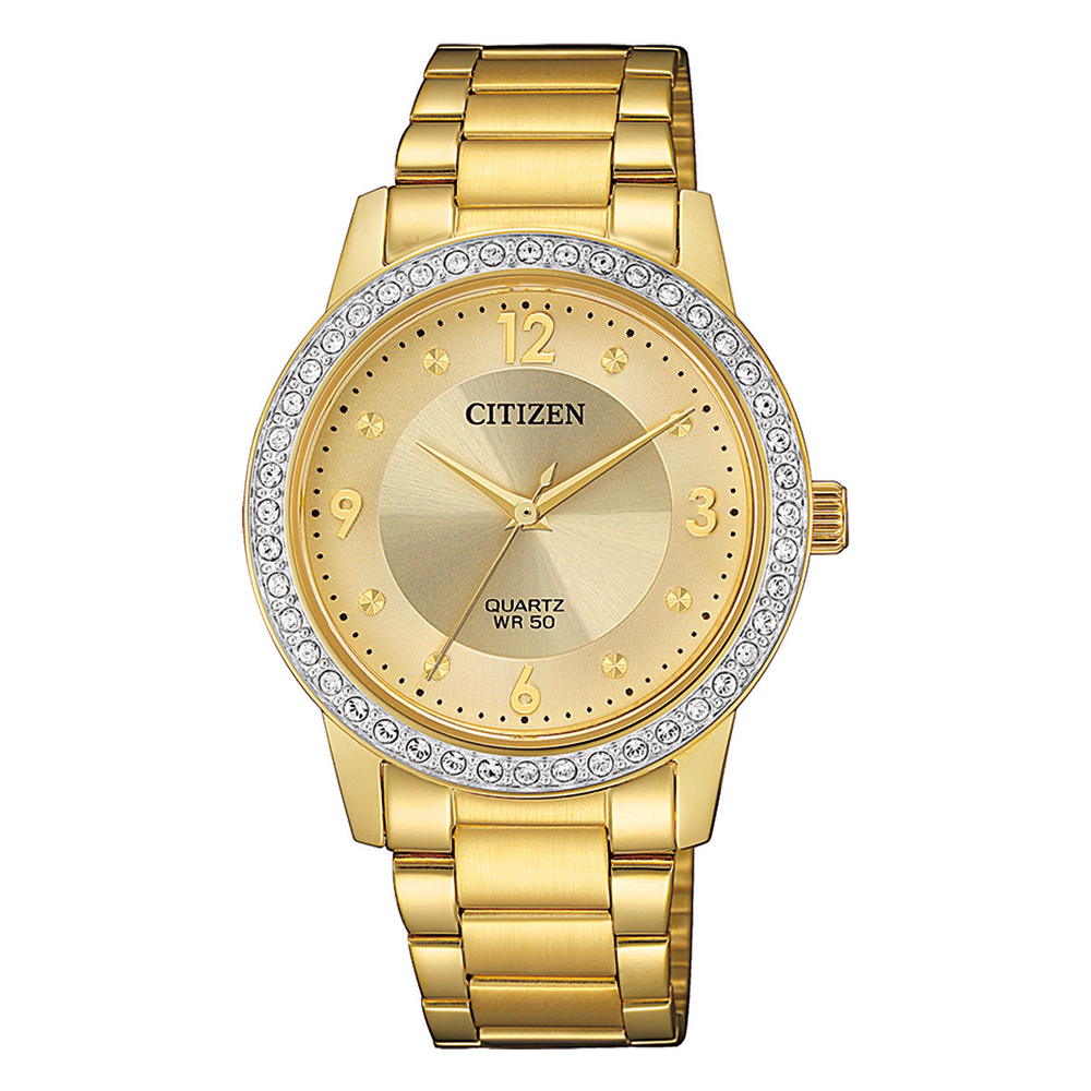 Experience the perfect blend of sophistication and style with this exquisite women's gold watch. Designed to make a statement, this timepiece features a stunning crystal-embellished bezel that adds a touch of brilliance to every occasion. The refined gold-tone stainless steel case and matching bracelet exude timeless elegance, while the sleek gold hands and minimalist markers ensure effortless readability. Crafted for both style and durability, this watch offers 50 meters of water resistance, making it a versatile accessory for any setting. Elevate your wardrobe with this distinguished timepiece, a true symbol of grace and refinement.
