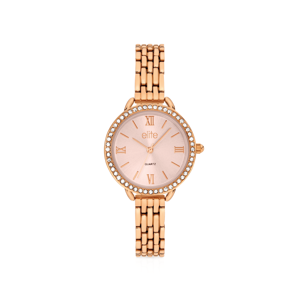 Radiate timeless elegance with Adaline, a dazzling rose gold-tone watch that brings classic charm into the modern moment. Its sun-brushed rose gold dial, adorned with Roman numeral hour markers, creates a look thats both refined and radiant. Encircled by a ring of sparkling crystals and paired with a polished multi-link bracelet, Adaline is more than just a timepiece its an everyday statement of sophistication. Lightweight yet eye-catching, it's the perfect accessory for everything from boardrooms to brunch dates.