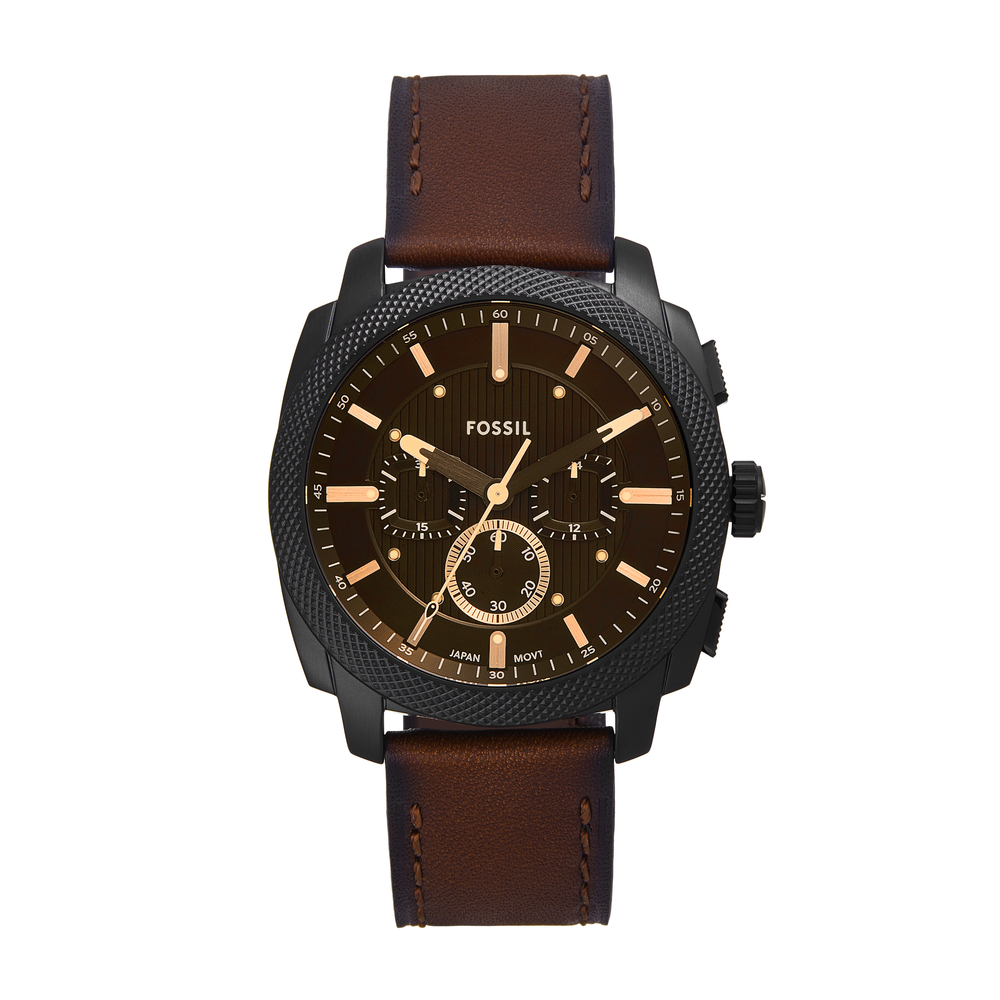 Inspired by classic American machinery, the Machine Chronograph commands attention with its bold knurled topring. Unmistakably masculine with a bold 44mm case housing a brushed black dial with textured details, all protected by an amber-tinted mineral crystal face. Powered by a precision quartz chronograph movement, this rugged timepiece is built to last with a rich brown leather strap. A true statement in industrial-inspired design.