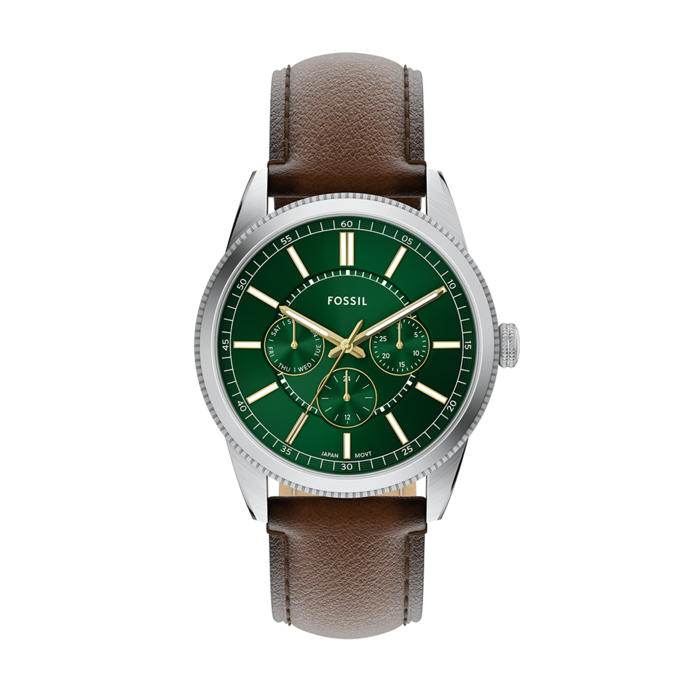 A stainless steel-tone case frames a green dial with sunray finishing, creating subtle texture and depth. The green dial features a sunray finish for added depth, complemented by practical sub-dials for day, date, and 24-hour functionality. Paired with a rich brown leather strap, it combines everyday comfort and polished craftsmanship. Thoughtful material choices and a balanced design make this watch a refined addition to your accessories lineup.