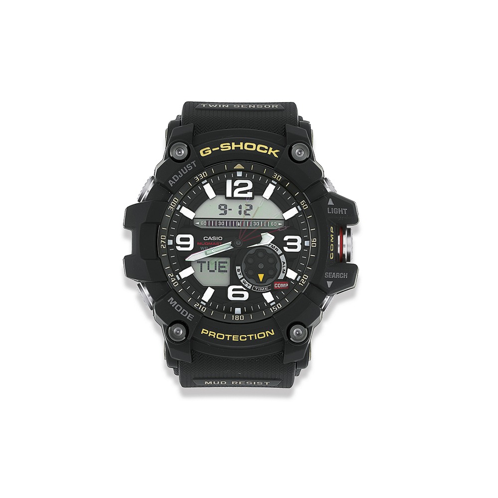 This is a Twin Sensor model from the G-Shock Mudmaster Series, designed for use in extreme environments scattered with rubble, dirt and debris. With a push of one large button at the 3 o'clock position, you can check your position with its Compass. The temperature can also be measured easily by pushing the button at 4 o'clock. This model has been developed with operability in mind so that anyone can intuitively check their position using the Compass, even in the most extreme climates, without visual observation. The dust and mud-resistant button guard cylinder structure prevents fine sand and mud from getting into the buttons while also helping to absorb any shock to the buttons and improving operability. Broad hour/minute hands and indices of large Arabic numerals have also been adopted to improve visibility. This design is packed with military-style flare, including a mode display that uses a sprocket-inspired disk dial and a textured band to prevent slipping.