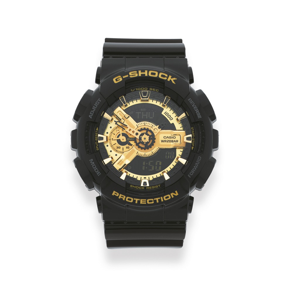 A model from the G-SHOCK black and gold series, continuing the pursuit of toughness. Uses the GA-110 as the base model, which has original functions and design. Equipped with a speedometer and featuring a three-dimensional face design with small parts in layers. Coloring is an energetic glossy gold on a characteristically rustic G-SHOCK all-black body. The glossy paint over the entire body and the texture of the mirror treatment applied all over combine to create a gorgeous, cool design. A G-SHOCK that combines technology and advanced design.