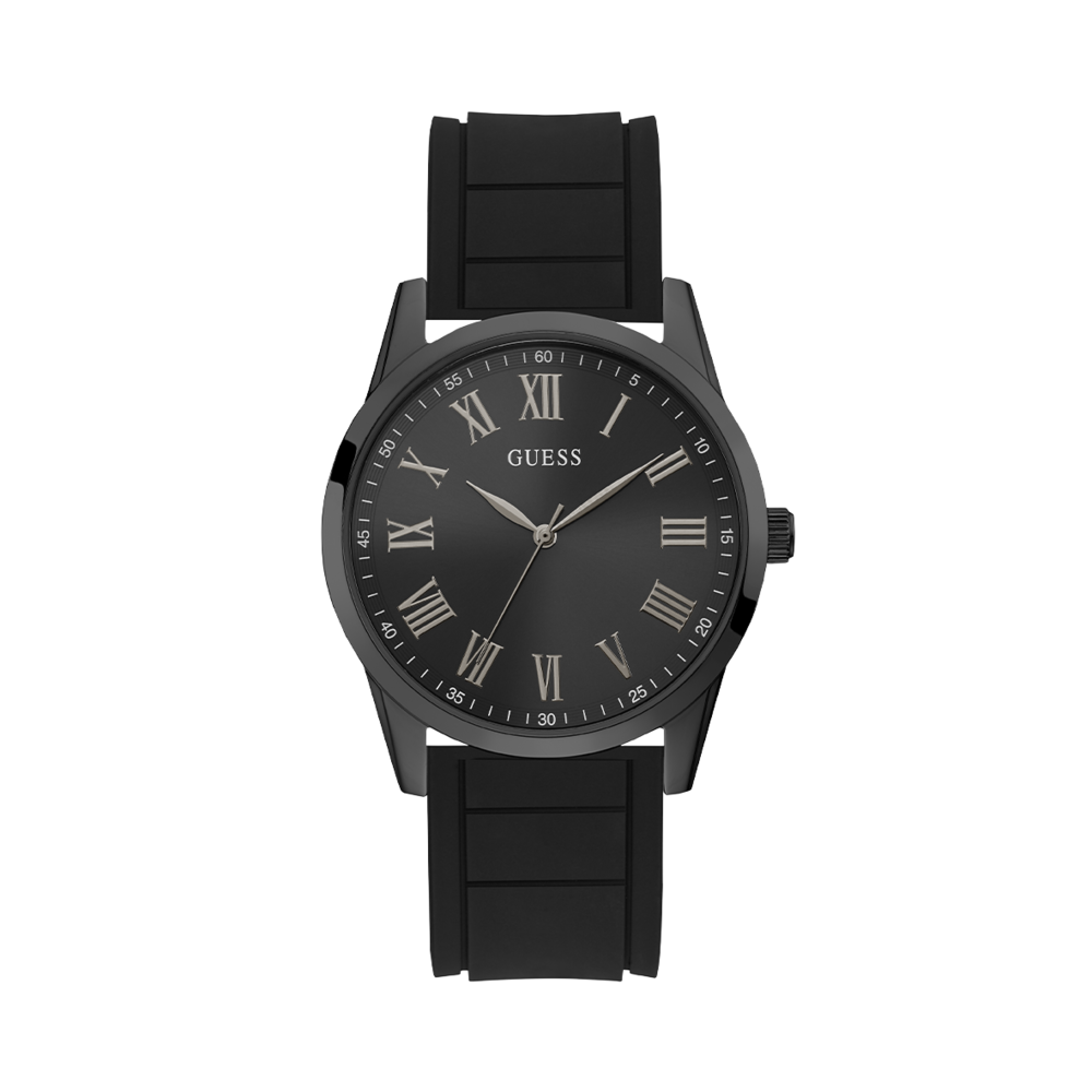 This dressed up timepiece has a black dial with roman numerals and a comfortable, smooth silicone strap.