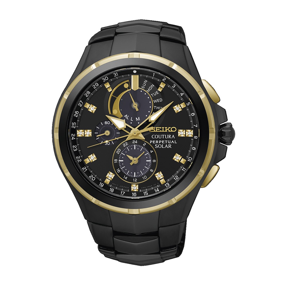Seiko Coutura Men's Black and Gold Tone, Solar Powered, Chronograph, 11 Diamonds set Dial, Perpetual Calendar, Sapphire Glass, 100m Water Resistant Watch