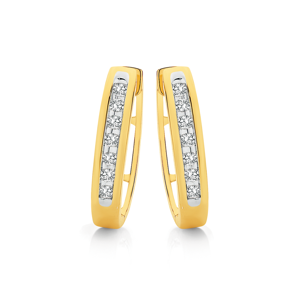 9ct Gold Diamond Channel Set Huggie Earrings Total Diamond Weight = .10ct. External Size = Approx. 13mm x 3mm.