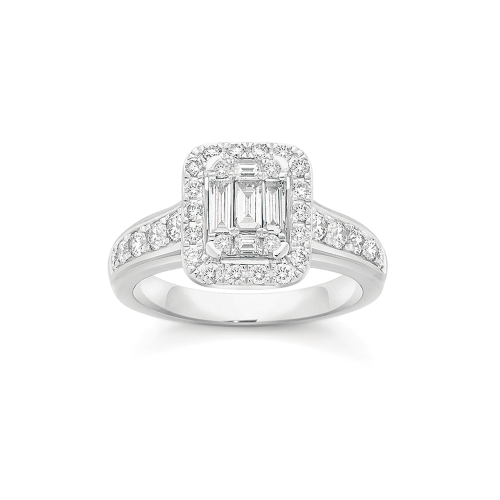 9ct White Gold Diamond Round Brilliant & Baguette Cut Emerald Shape Shoulder Set Dress Ring Total Diamond Weight = 1.00ct.