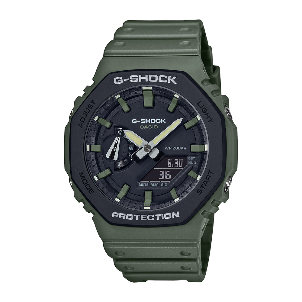 From G-SHOCK, the toughness watches that continue to evolve in search of ultimate strength, this model adorned with utilitarian colors is based on the thin analog-digital combination GA-2100 model. Uses practical utilitarian colors that go well with street fashion for the bezel, dial, and band. The design exudes a casual individuality and goes well with various types of clothing and environment. A double-molded bezel cover has also been used to further advance the design. A G-SHOCK that incorporates a thin case into the design.