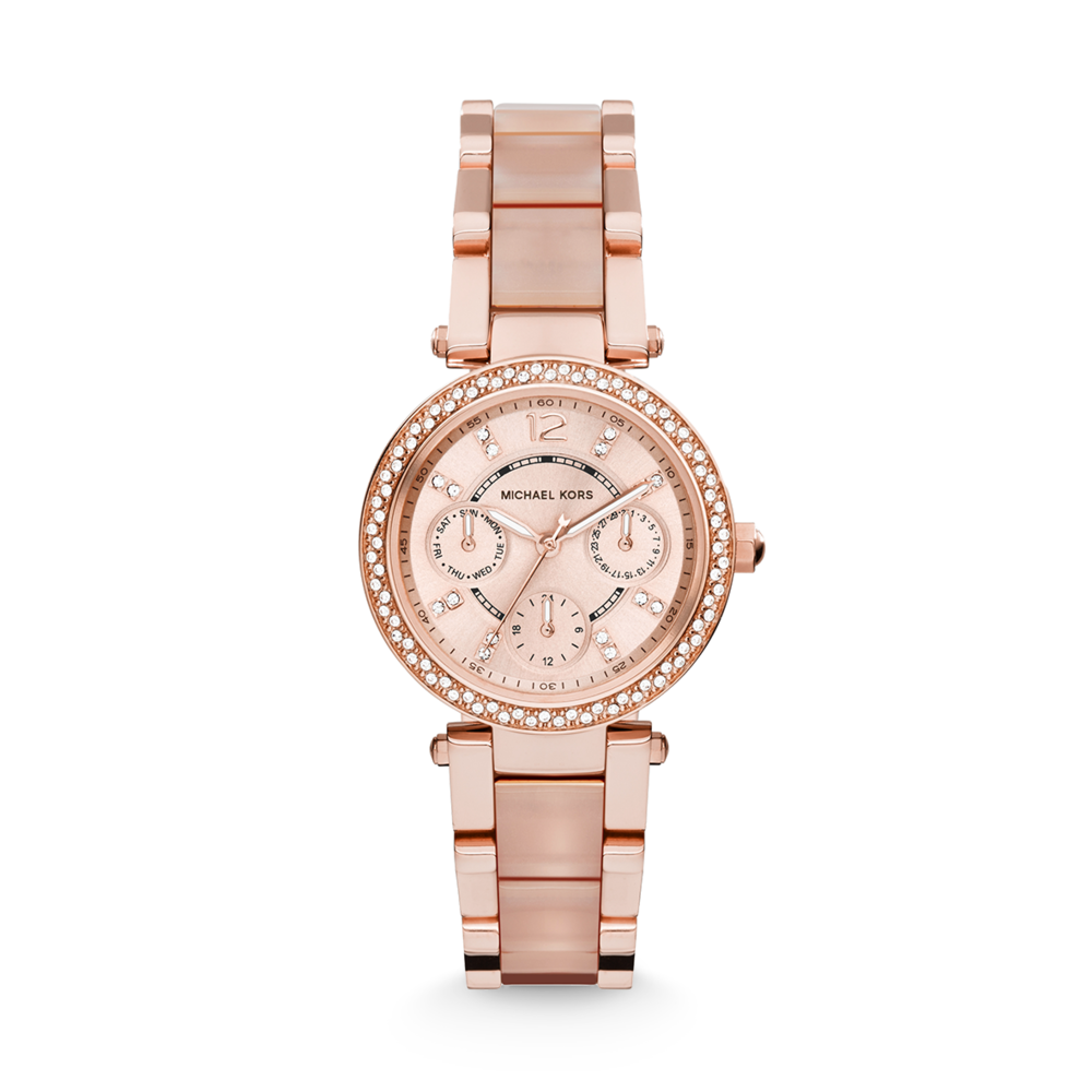 This watch fits the description of a crystal-studded dream watch. It has a rose gold facade decorated with crystals and a three link bracelet. The dial has three subdials and rose gold-toned hour and minute hands. The markings are decorated with crystals as well. The subdials are for the day, date and 24 hours recognition and the dial also bears the iconic Michael Kors logo.