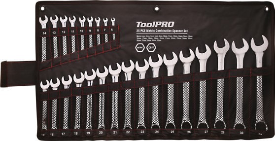 6-28, 30 & 32mm. Made from durable chrome vanadium steel (Cr-V). Stored in a convenient tool roll.