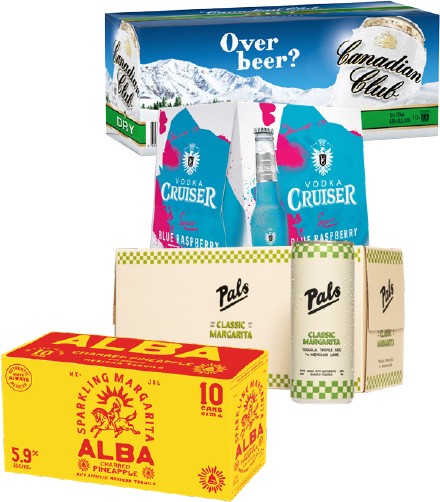 Canadian Club & Dry or Soda & Lime 4.8% 10 X 330mL Cans, Cruiser Range 4.8% 12 X 275mL Bottles, Pals Margarita Range 5.8%