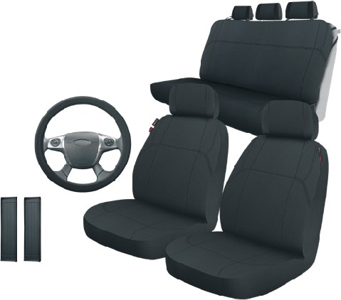 Contains 2x front seat covers; 1x rear seat cover; 1x steering wheel cover; 2x seat belt pads.
