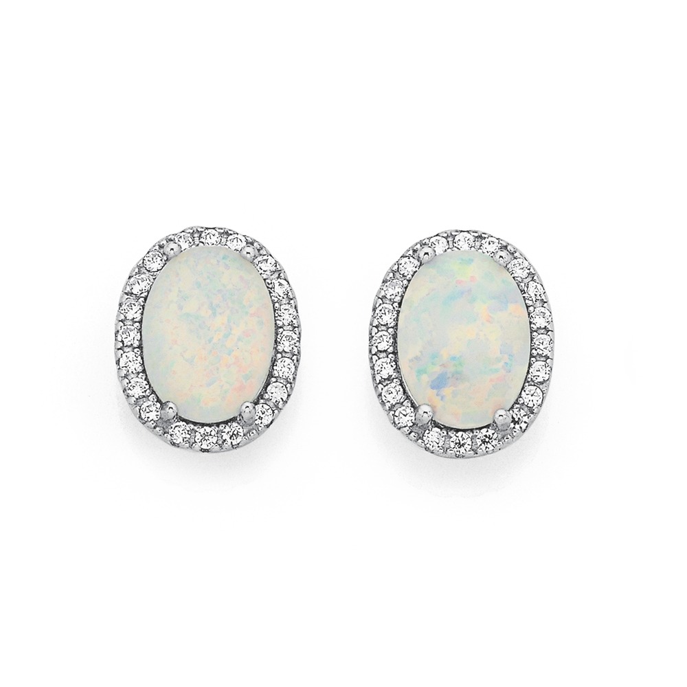 Sterling Silver Synthetic Opal & CZ Oval Halo Stud Earrings 1621320
