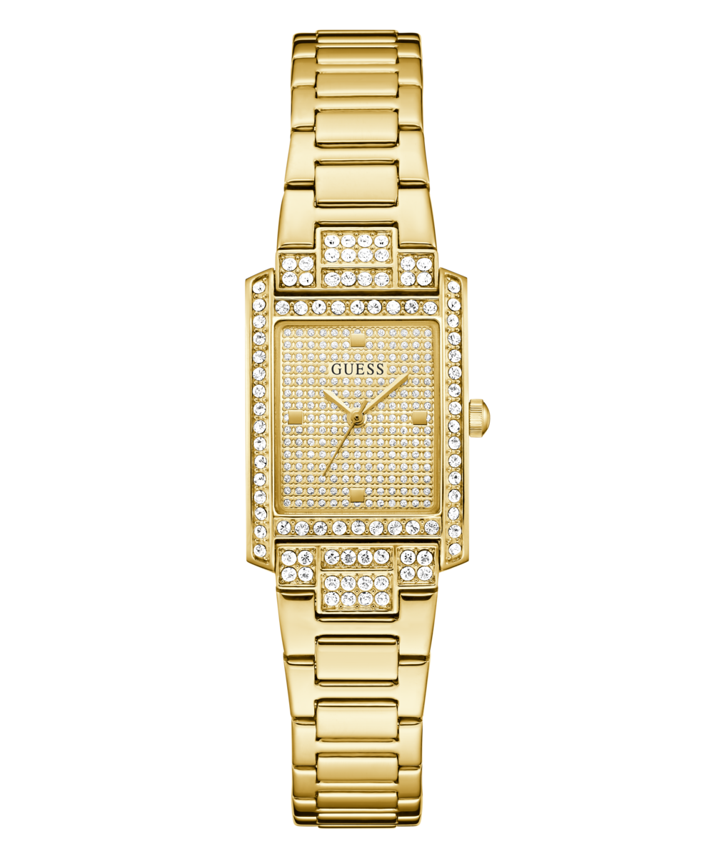 Unapologetically modern, this watch delivers pure style. The 23mm rectangular crystal enriched case and gold tone finish bring instant impact, while the minimalist dial and sculpted bracelet let you shift seamlessly from power dressing to after-hours polish.