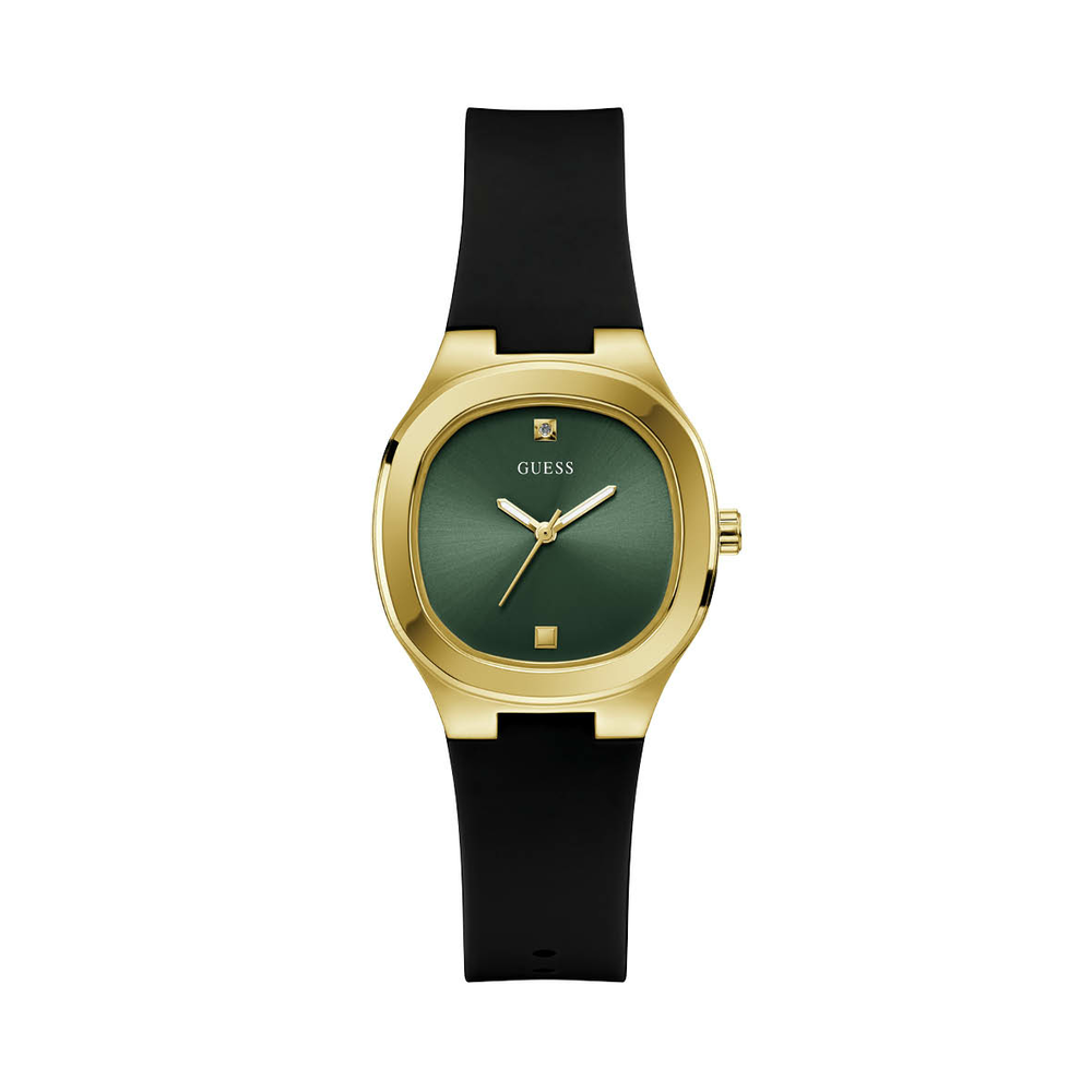 Exuding modern, sporty style with this sleek new timepiece from GUESS Watches, featuring a new rounded square case with a genuine diamond marker at the 12 o'clock hour. The minimalistic 32mm gold tone case showcases a gorgeous green dial and smooth black silicone strap for ultimate comfort.