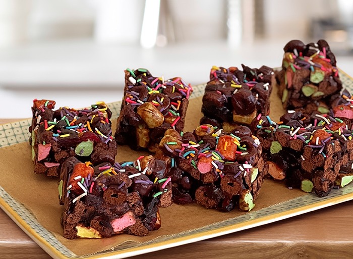 5. Press the mixture firmly into a lined loaf tin and sprinkle the top with sprinkles.