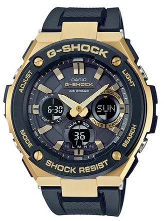 From G-SHOCK, the watch brand that is constantly setting new standards for timekeeping toughness, comes the GSTS100G-1A G-STEEL, a watch with a new "layer guard structure". Different materials are used for the bezel to create a two-layer structure that adds a new dimension of shock resistance. This GST-S100 model features a tough, quality design moulded of resin intended to cushion the lower part of the watch against impact from the upper part. A hand shift feature temporarily moves hands out of the way with the press of a button for easy reading of digital display contents, while double LED face illumination keeps information easy to read at all times.