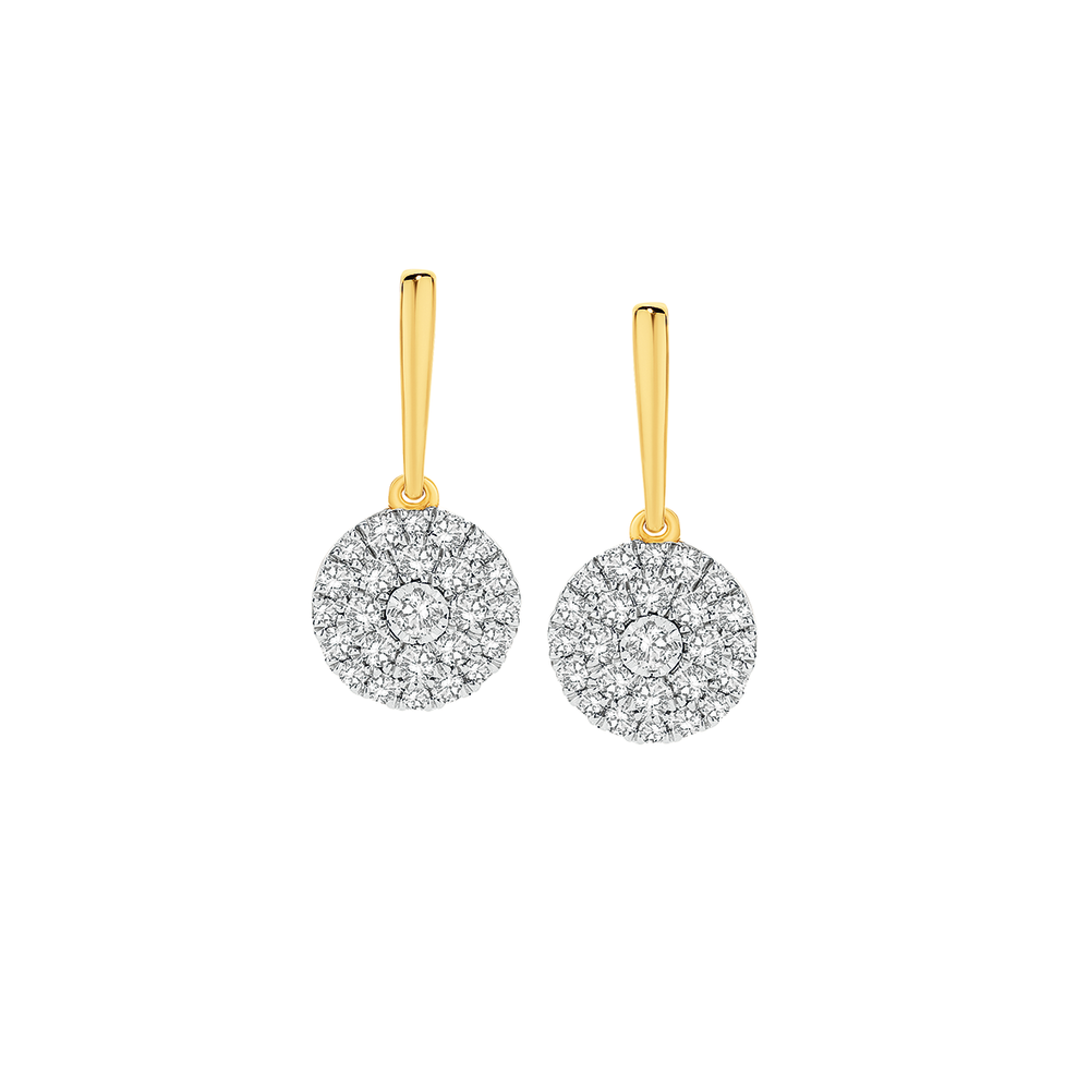 9ct Gold Diamond Round Brilliant Cut Cluster Drop Stud Earrings Total Diamond Weight = .50ct. Size = Approx. 17mm x 8mm Including Drop.