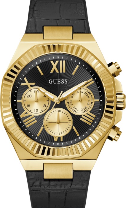 This oversized dress style from GUESS Watches features a bold 44mm gold-tone coin edge bezel, black multifunction dial. Our signature FLEX strap features a black croco leather overlay on a comfortable silicone strap to complete this iconic look.