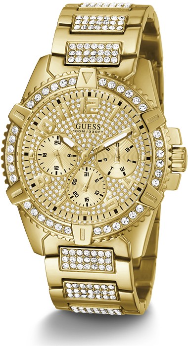 Stand out with the Frontier timepiece by Guess. This tantalising watch features a polished gold tone case with crystals, sunray champagne glitz multi-function dial and a polished gold tone bracelet with crystals.
