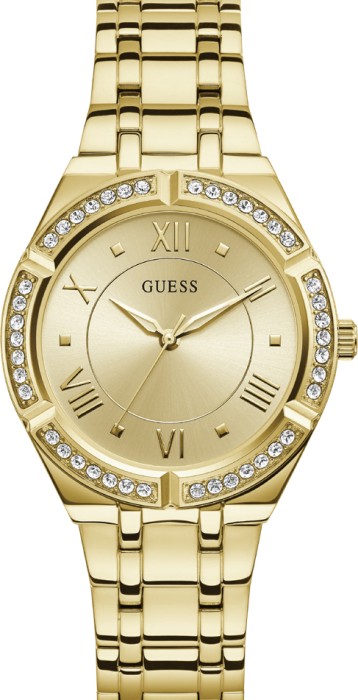 A timepiece borrowed from the GUESS guy but updated with crystal embellishments on the case and a champagne dial for a fully feminine feeling. This iconic GUESS timepiece on a gold bracelet is guaranteed to be a wardrobe staple that can elevate any look with a luxurious modern twist.