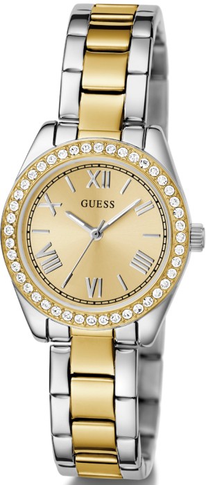 A new petite version of a GUESS Watch icon, this sweet and sophisticated new style features a crystal enriched bezel on the 30mm case with a classic champagne dial and sleek silver and gold-tone bracelet. - Case Diameter: 30mm - Case Colour: 2-Tone - Dial Colour: Champagne - Strap Type: Recycled Steel - Strap Colour: 2-Tone - Closure Type: Pilot Buckle - Movement: Quartz Analogue - Case Material: Recycled Steel - Water Resistance: 3ATM - Warranty: 2 Year Limited