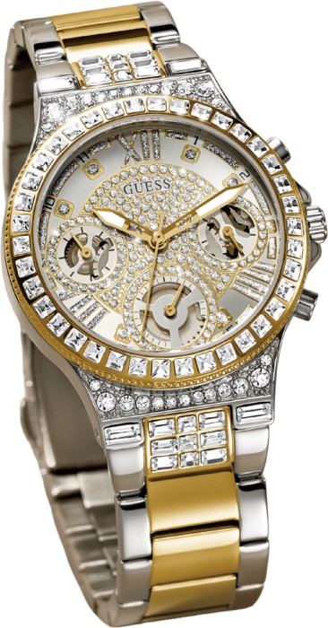 Shine effortlessly in this crystal-adorned timepiece from GUESS Watches. With a 36mm gold and silver-tone case, glimmering silver dial, and a matching duo tone bracelet, this watch delivers standout sparkle inspired by the glow of moonlight.