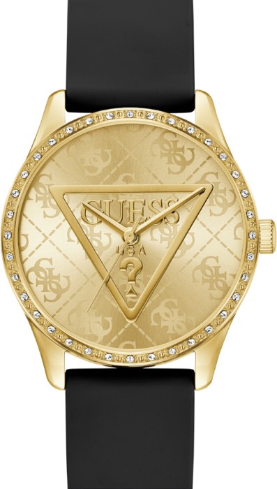 This standout timepiece from GUESS Watches redefines logo style with sophistication. A champagne dial features our iconic triangle as well as a ghosted Quattro "G" logo, creating a look thats both confident and contemporary. Finished with a 36mm gold-tone case and smooth black silicone strap, it transitions seamlessly from day to night.