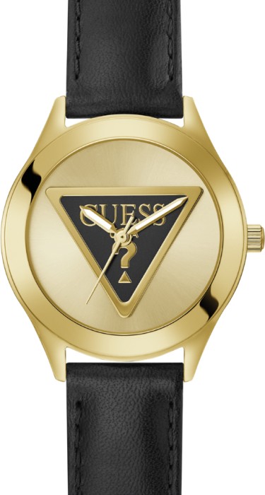 This new collection pays homage to the iconic Guess triangle and instantly elevates any outfit. This stylish watch features a polished gold tone 34mm dial with our GUESS triangle adding a playful touch to the time. With a comfortable smooth black leather strap, you'll love stepping out in style in this accessory.