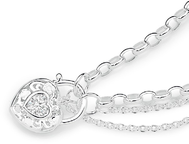 Sterling Silver Cubic Zirconia 18.5cm Heart Bezel Padlock Bracelet