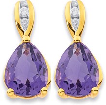 9ct Gold Pear Cut Amethyst & Diamond Stud Earrings. Total Diamond Weight = .05ct. Amethyst Size = 8x6mm. Approximate Dimensions 14x8mm.