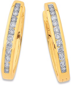 9ct Gold Diamond Channel Set Huggie Earrings Total Diamond Weight = .50ct. External Size = Approx. 21mm x 3mm.