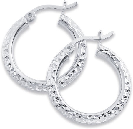 These diamond cut sterling silver hoops give a subtle sparkle. Internal diameter measures 15mm approx. External diameter measures 20mm approx. 2.7mm wide approx.