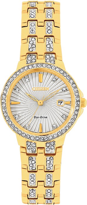 For an elegant accessory to complement every outfit, this striking model is the perfect choice. Crafted with crystals and a gold stainless steel case and bracelet. The bezel and the mother-of-pearl dial feature additional crystals rounding out the look. The watch is an ideal choice for those looking to transition from day to evening looks without missing a beat. Powered by Eco-drive, never needs a battery, only a light source.