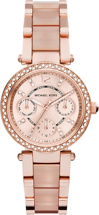 This watch fits the description of a crystal-studded dream watch. It has a rose gold facade decorated with crystals and a three link bracelet. The dial has three subdials and rose gold-toned hour and minute hands. The markings are decorated with crystals as well. The subdials are for the day, date and 24 hours recognition and the dial also bears the iconic Michael Kors logo.