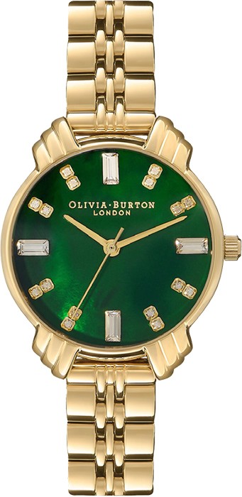 Inspired by the Art Deco aesthetic, this golden watch is throwing it back to the roaring 20s. Mesmerising and decadent, the emerald-green dial has a mother of pearl finish with?lavish baguette crystal markers that catch the light. Paying homage to Art Deco architecture, we've finished the case with sleek geometric fan detailing and a modern bracelet strap. It's the must-have party piece of the season.