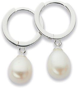 Sterling Silver Cultured Freshwater Pearl Drop Huggie Earrings - Approximate Dimensions 2mm Width x 12mm Outer Diameter