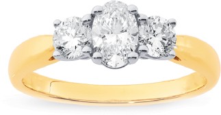 A beautiful 14 carat yellow gold, 3 stone ELEMENT lab diamond ring with a total weight of 1ct. The oval center stone is 0.50 carat. This ring has FG/VS colour and clarity and the centre stone has a diamond IGI certificate.