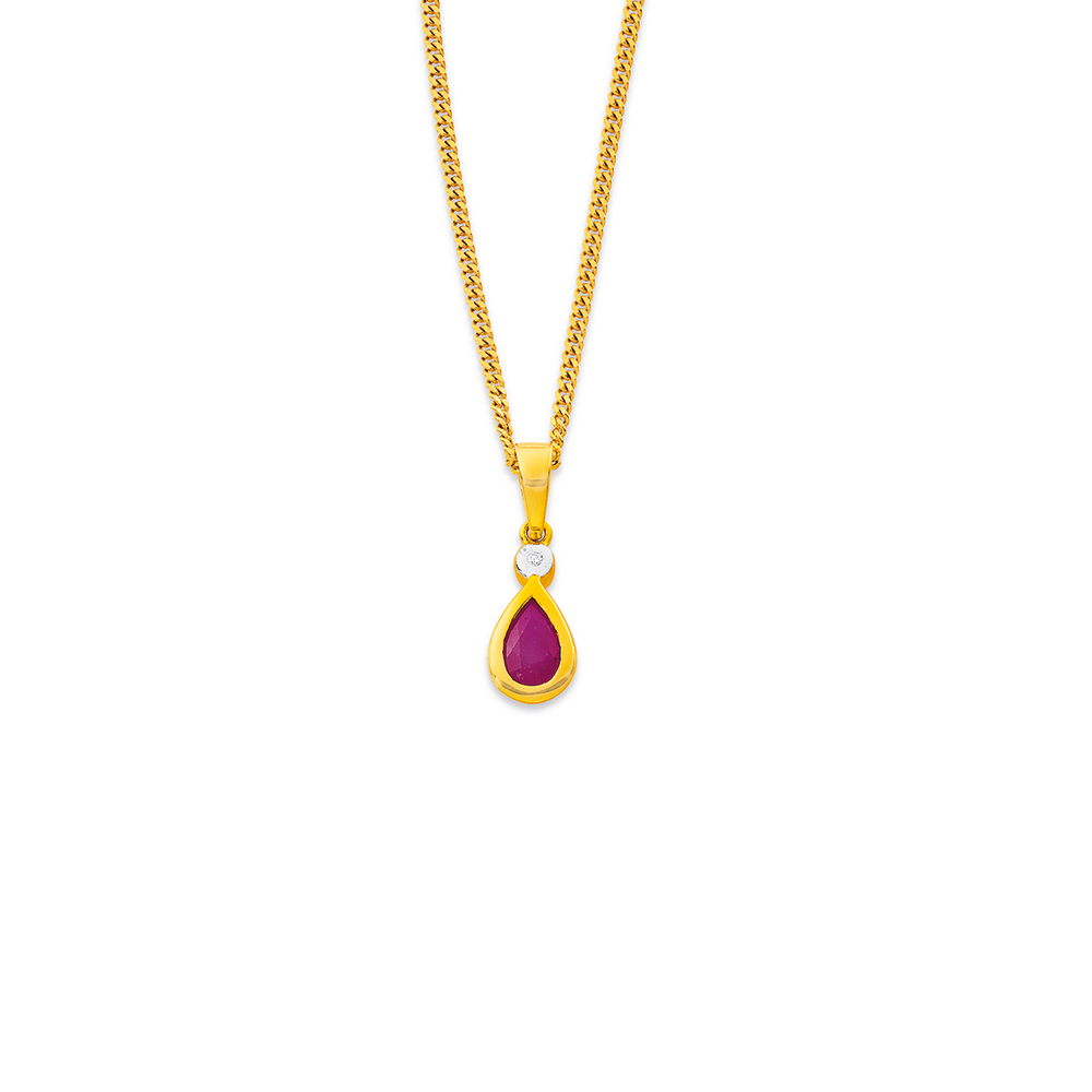 9ct gold pendant features a pear-cut natural ruby with diamond. Approximate16mm Height with bale