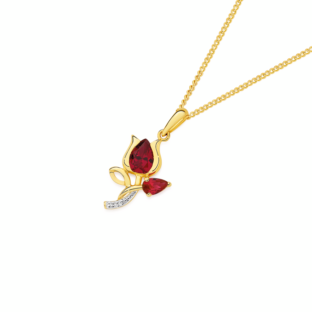 9ct gold tulip pendant features two pear-cut created rubies (7x5mm and 5x3mm) and is accented with diamonds, Approximate Height (including bale) = 25mm, Width = 17mm