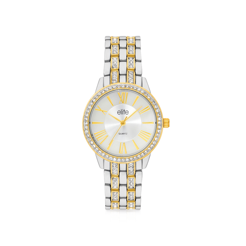 Bold, brilliant, and beautifully refined the Charlie watch is made to dazzle. Featuring a radiant two-tone finish throughout, this timepiece commands attention with its dual-row crystal-set bracelet and sparkling crystal bezel. The silver sunray dial is adorned with elegant Roman numerals, giving it a classic touch that balances the shimmer with sophistication. Whether you're dressing up for a special event or adding a touch of glamour to your everyday style, Charlie is your go-to for timeless sparkle.
