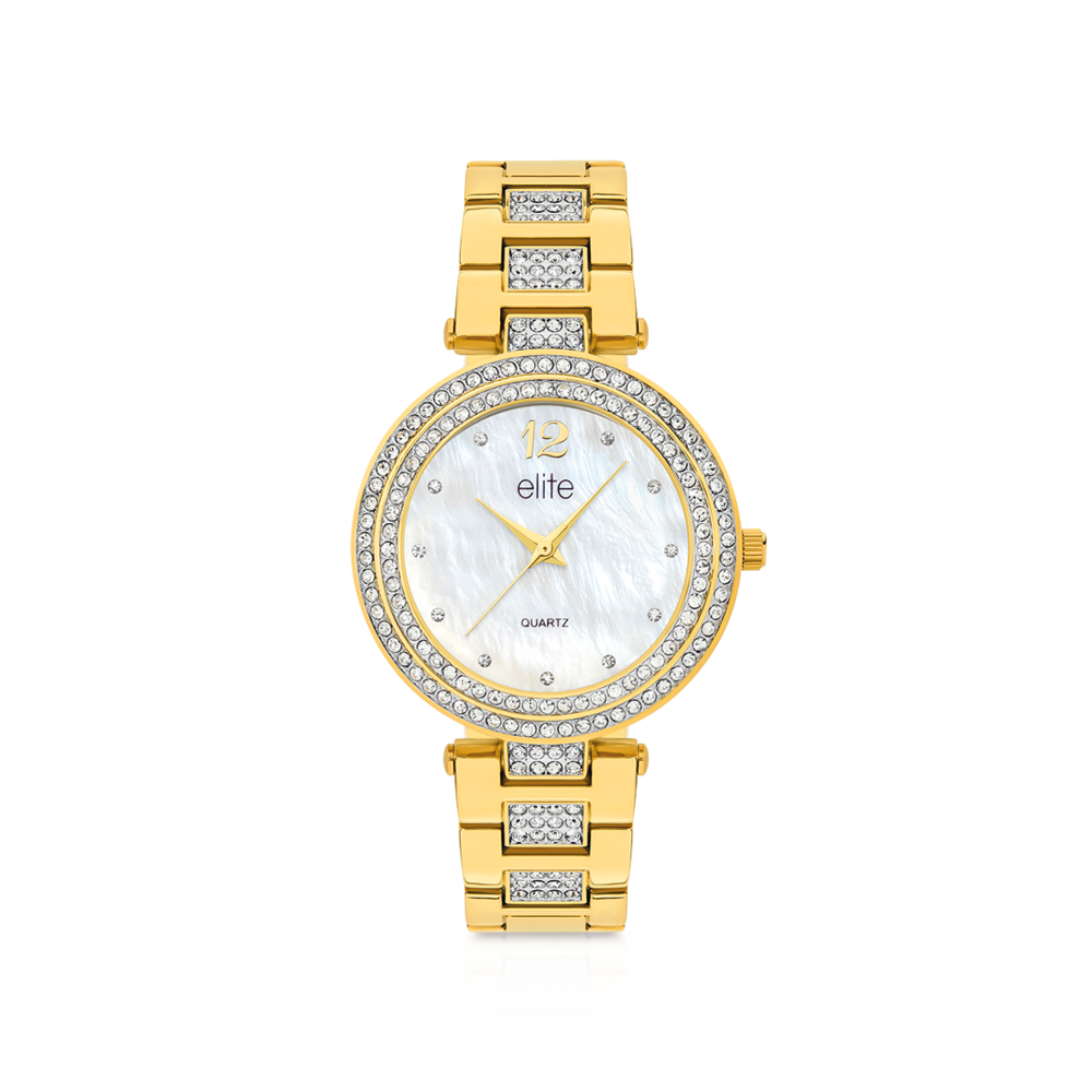 Elite Ladies Gold Tone, Mother of Pearl Dial, Stone Set Bezel Watch 5081066