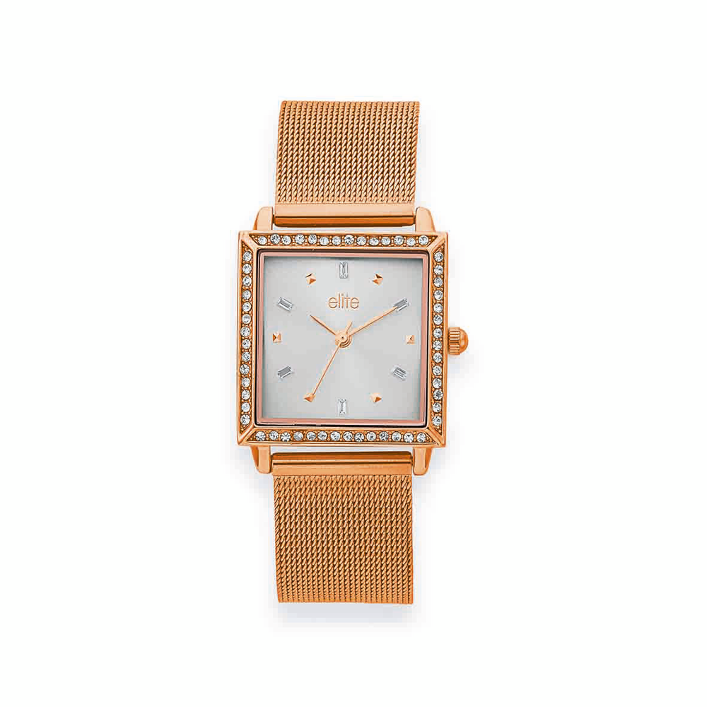 Elite Ladies Rose Tone, Sqaure Dial Stone Set, Mesh Band Watch 5081049
